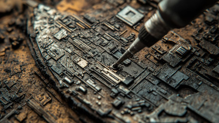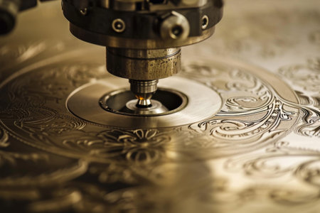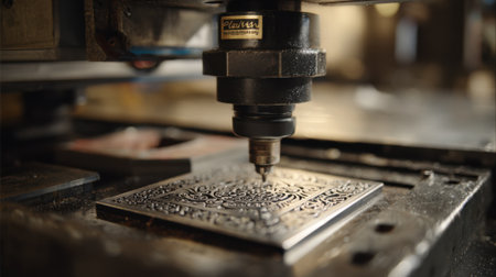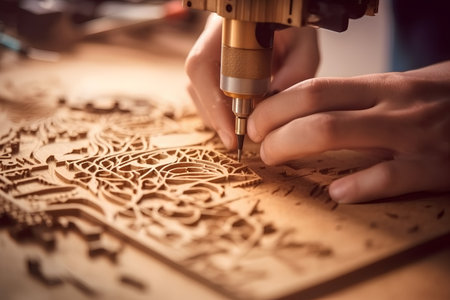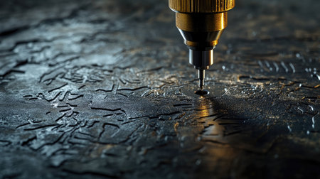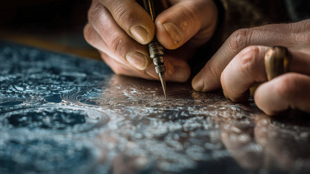 A close-up view of a precision engraving tool working on a dark textured surface, showcasing the artistry in craftsmanship and detailed design.