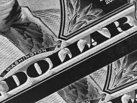 Large inscription dollar on the diagonal of the picture. Composition of 1 dollar American bills. Inverted black and white photo. US economy, Fed, refinancing rate. Macro