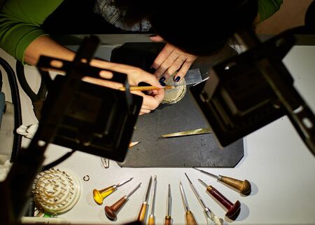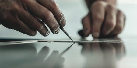 Close up of a hands working with precision on reflective surface. Photo with a subtle grain, soft focus blur