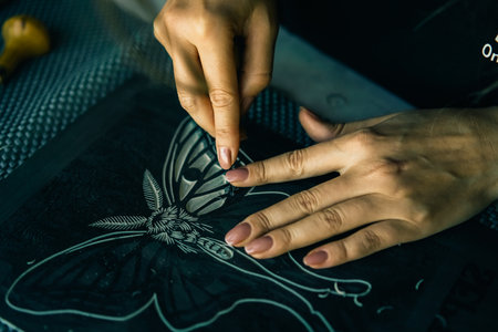 A close-up of a tattoo artist's hands, carefully working on a detailed design in a tattoo parlor
