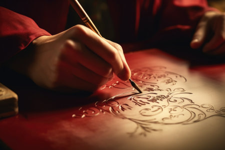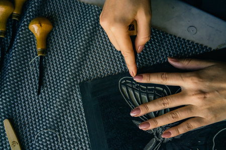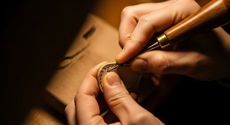 Skilled craftsman hands carefully carving elaborate designs into a piece of natural vegetable tanned leather using specialized tools. focus on traditional craftsmanship and detailed artistry.