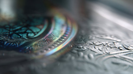 A detailed shot of a digital watermark embedded in a holographic design on a luxury item showcasing the complexity and security features of modern anticounterfeit solutions
