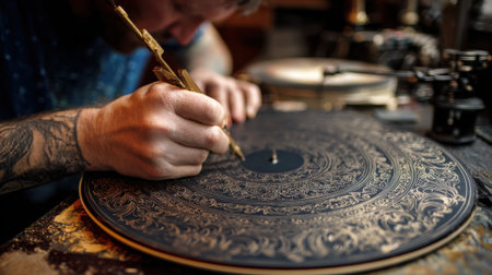Technician etching intricate designs onto a vinyl record surface emphasizing the detailed craftsmanship in unique and personalized record editions.
