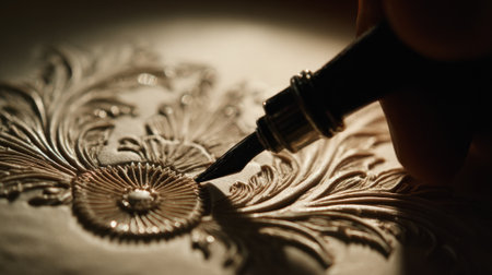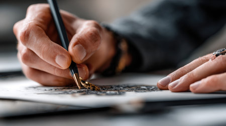 Skilled jeweler hand holding gold pen for precise handwriting generated by artificial intelligence