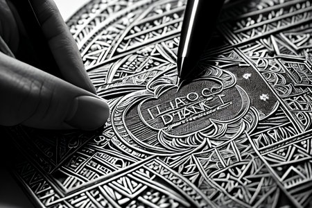 Close-up view of an artist's hand using a pen to create detailed artwork on paper, imparting creativity and skill in a calming studio environment filled with art tools.