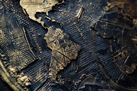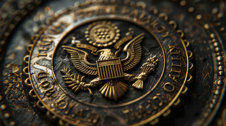 Detailed view of an intricate emblem of a bank or financial institution against a black backdrop, Embossed logo of a bank or financial institution on a credit card