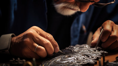 Close-up of Hands Engraving Ornate Pattern on Silver Surface