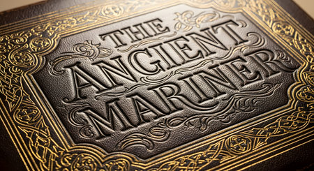 A close-up shot of an elegant, leather-bound book cover featuring the title The Ancient Mariner embossed in a classic font with gold foil. Ornate, decorative borders frame the title, evoking a sense of classic literature, poetry, and antique craftsmanship.