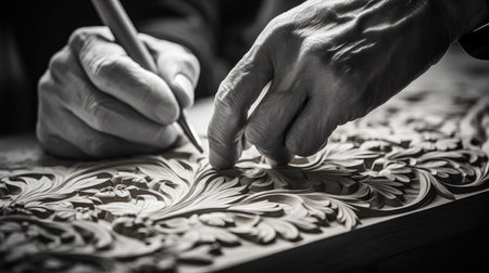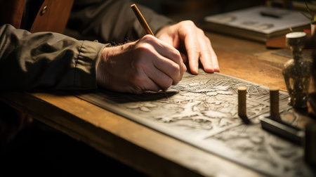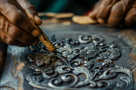 Artisan meticulously engraves a floral design onto a metal surface, showing the beauty of traditional craftsmanship