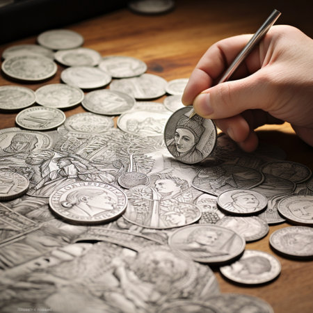 Step into the fascinating world of ancient currency with this detailed line drawing that showcases the intricate designs and cultural significance of historic coins. In this artwork, a person's hand gracefully holds a collection of distinctive ancient coins from various civilizations and eras. Each coin is beautifully aged to highlight its historical significance, with meticulously rendered details that captivate the viewer. This composition embodies the richness of heritage and takes us on a mesmerizing journey through time.