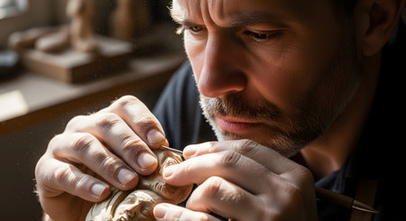 With intense concentration, a mature male woodcarver uses a fine tool to meticulously sculpt the details of a small wooden figurine. The close-up on his face and hands reveals the dedication and skill required for this traditional craft, with wood dust floating in the air of his workshop.
