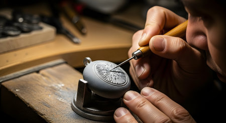 Close-up of a jeweler engraving a custom design onto a silver pendant, using a specialized engraving tool for detail work