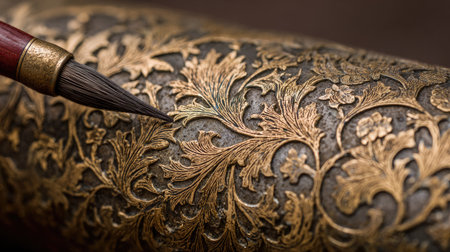 This stunning close-up captures the intricate artistry of gold leaf engraving on an antique surface, showcasing delicate patterns and craftsmanship.