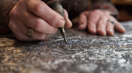 Close up of artisan hands using a chisel to create detailed engravings on a metal plate, showing the precision and artistry of metalworking