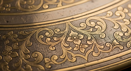 A macro shot of an intricate floral pattern engraved into a gold or brass metal surface. The detailed scrollwork and textured background suggest luxury, antique craftsmanship, and classic design.