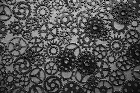 Old mechanism with pinions. Retro style black and white. Macro photo.