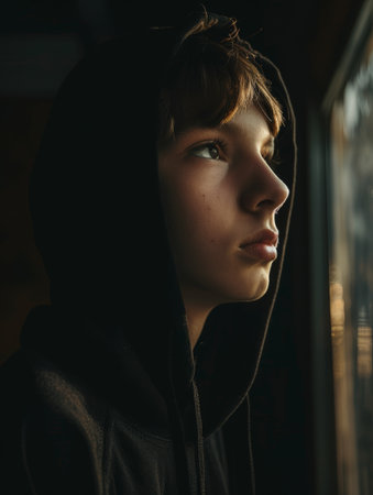 Young person gazing thoughtfully out a window on a quiet evening with soft lighting and deep reflections