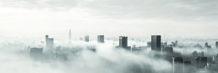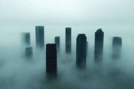 Atmospheric cityscape with skyscrapers peeking through dense fog