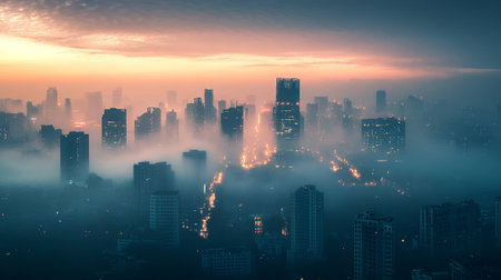 Fog envelops city skyline, creating mystical urban atmosphere in the early morning light