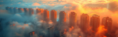 A breathtaking aerial view of a cityscape at sunset, with tall emerging buildings from a thick layer of fog. The sky is ablaze with vibrant hues of orange and red, casting a warm glow over the scene. The clouds above the buildings are tinged with a soft blue, adding a sense of depth and tranquility to the image.
