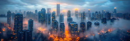A panoramic view of a modern city skyline with tall skyscrapers emerging from a thick layer of fog at dusk. The warm glow of city lights shines through the fog, creating a mesmerizing scene.