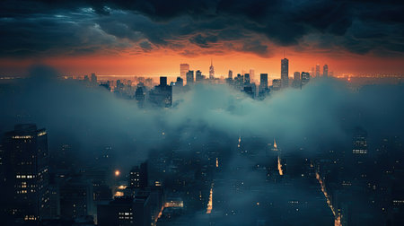 An aerial view of a city skyline at dusk, with towering skyscrapers emerging from a thick layer of fog. The warm glow of the city lights illuminates the clouds, creating a mesmerizing and atmospheric scene. The image captures the beauty and mystique of an urban landscape shrouded in fog.