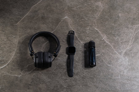 Niedomice, Poland - June 08, 2018: Equipment for a runner training. Pulse measurement kit - a heart rate monitor (Garmin), an isotonic drink, bananas, a towel, an iPod with dry jackets (Apple) and running shoes (Dynafit).