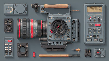 Detailed arrangement of vintage film camera equipment on a blue backdrop. Features various photography tools essential for capturing cinematic moments.