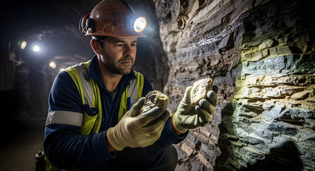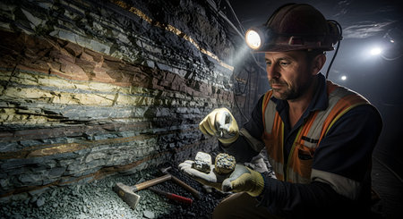 A miner wearing a helmet with a lit lamp examines rock samples containing ore deep inside an underground mine tunnel. The low light and rough rock walls emphasize the subterranean work environment.