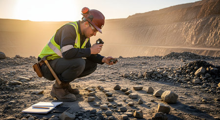 A geologist or miner wearing safety gear and a hard hat crouches in an open-pit mine to examine rock samples with a flashlight. The scene depicts mineral exploration, resource extraction, and the technical side of the mining industry.