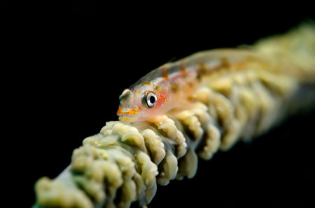 red ornate ghost pipefish isolated on black while hiding near crinoid diving indonesia