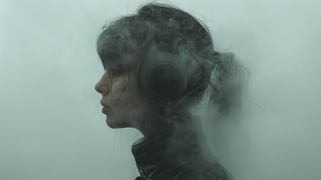 Dark portrait of a short haired girl wearing hoodie with smoke coming out of it.