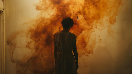 Black young adult woman suffering from depression, sad girl feeling apathy and melancholy, dark gray fog around her, she doesn't know what to do, AI generated image