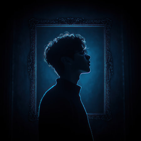 Person gazes at a blue wall, lost in thought. The dim light creates a reflective mood. The scene shows a moment of contemplation and stillness in a quiet space.