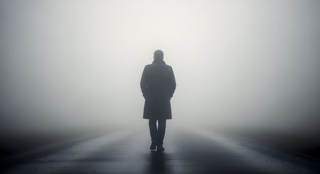 A lone man in a trench coat walks down a path, his silhouette receding into a dense, atmospheric fog. This moody and mysterious image symbolizes uncertainty, solitude, depression, and the journey into the unknown.