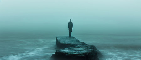 Tranquil figure stands quietly on a misty pier, fully embracing the profound silence and stillness of the fog. Generative AI