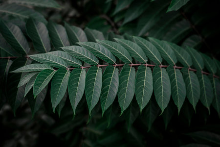 Close-up of lush green leaves of an Ailanthus altissima (tree of heaven, ailanthus, Ghetto Palm, stinking sumac, varnish tree, or Chinese chouchun tree), a Simaroubaceae plant.
