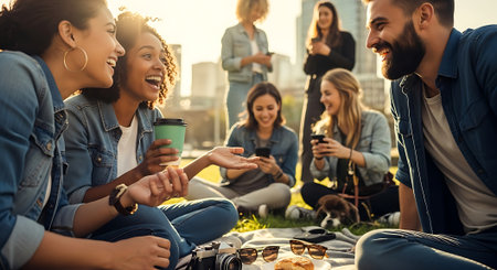 A group of friends enjoying a picnic in a park, laughing and sharing stories, with a city skyline in the background