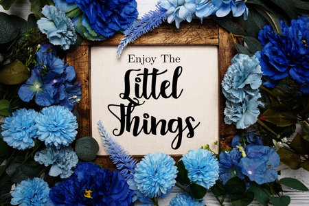 Enjoy The Little Thingsy text with flowers decoration on yellow background