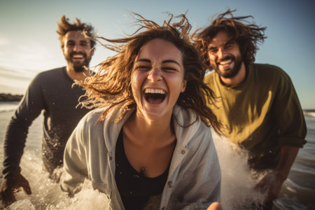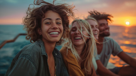 Cheerful multicultural friends portrait image, ai generated. Happy adults enjoying warm evening on waterfront picture photorealistic photography. Summer vacation concept photo realistic