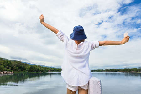 back of young happy woman in white shirt and short holding up her hands joyfully with her phone in her hand, in front of a beautiful lake with view of white clouds and blue sky, concept of freedom, travel, wireless connection, or modern lifestyle for youn