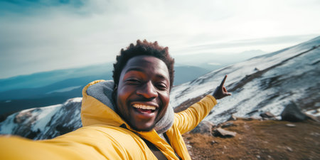 African hiker man taking selfie portrait on the top of mountain, Happy guy smiling at camera, Tourism, sport life style and social media influencer.