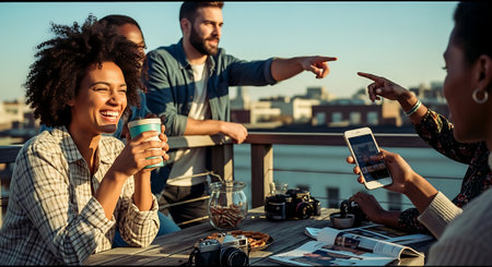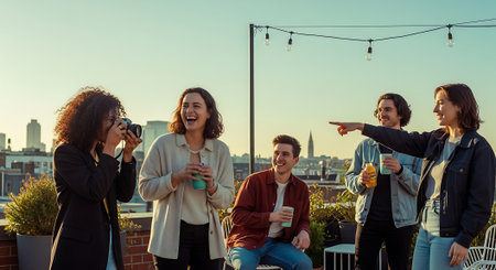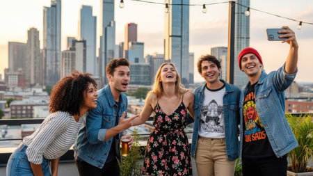 A diverse group of friends gathers on a rooftop, taking a selfie with a city skyline in the background. The image features a warm color palette with natural light, showcasing various expressions and clothing styles. Suitable for use in lifestyle articles or promotional materials, it can also be used to depict social gatherings or travel.