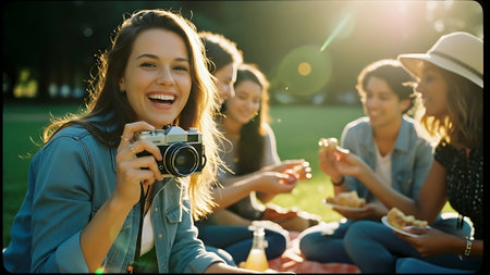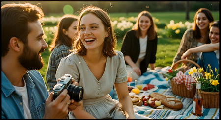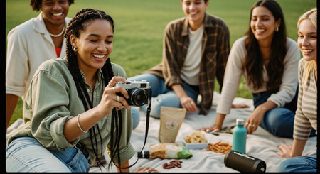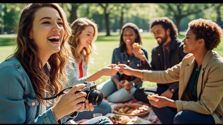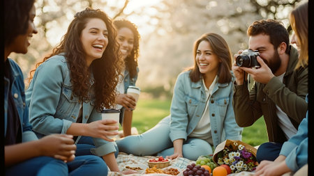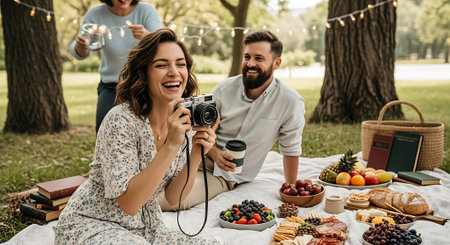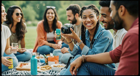A group of friends enjoying a picnic outdoors, smiling and laughing, one person holding a camera, surrounded by snacks and drinks