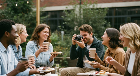 A group of friends enjoying a casual outdoor gathering, sharing food and drinks, with one person taking a photo