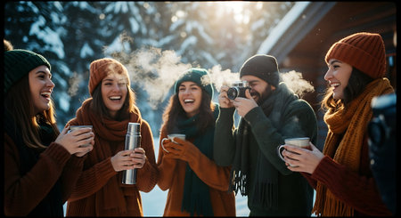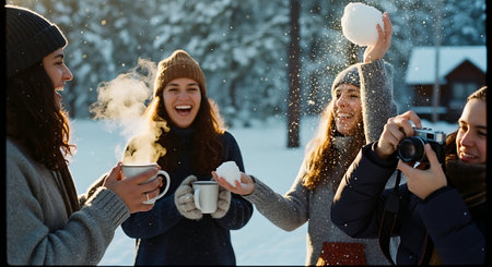 Group of friends having fun in the winter park. Women with cup of hot drink and marshmallow.