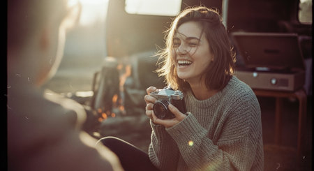 Young Woman Laughing and Holding a Vintage Camera at a Campsite