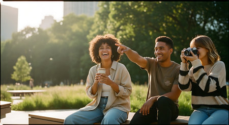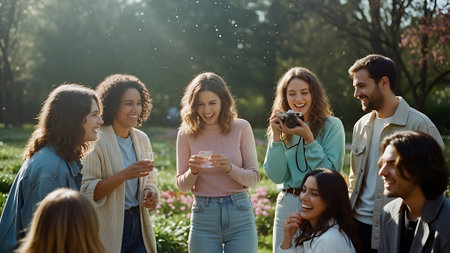 A group of friends enjoying a sunny day outdoors, laughing and sharing drinks, one person taking a photo with a camera