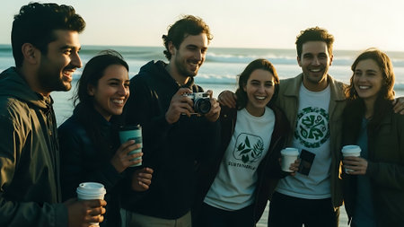 A group of friends enjoying a beach outing, taking photos, drinking coffee, and sharing laughter in a relaxed atmosphere