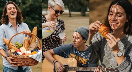 Collage of three young adults enjoying a picnic outdoors, with a woman holding a basket of food, another pouring a drink, and a man playing guitar while a woman eats a croissant.